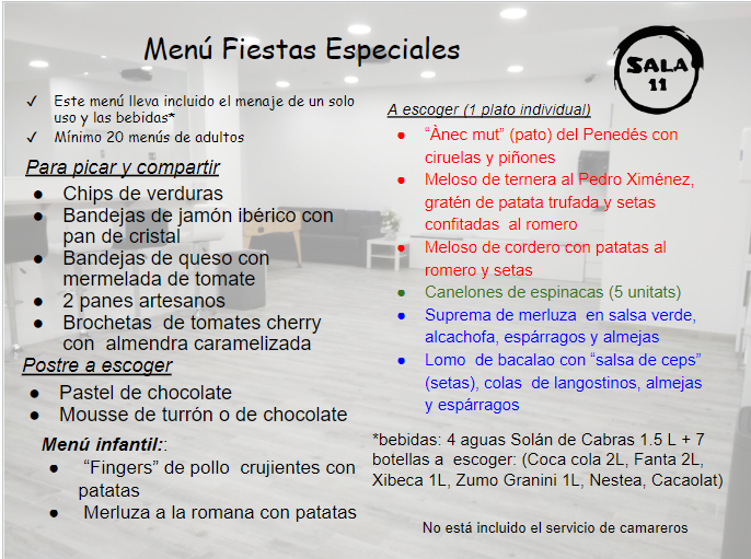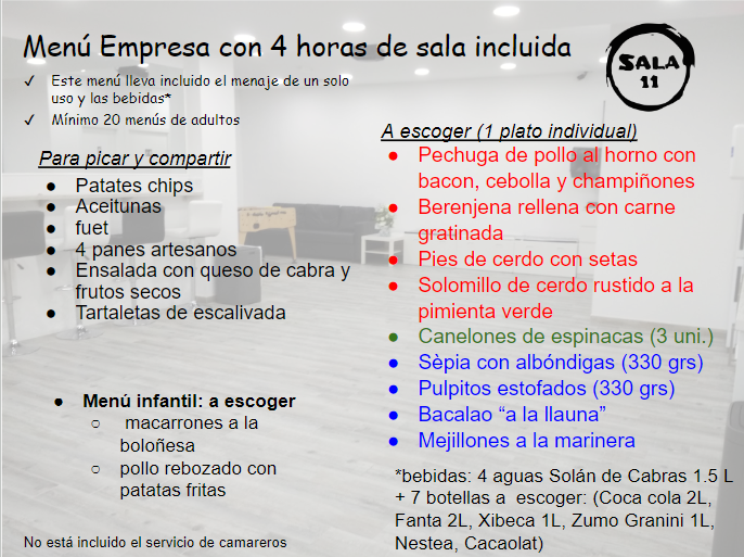 En Sala 11 disponemos de diferentes menús. Si quieres otros menús, contáctanos y lo hablamos.